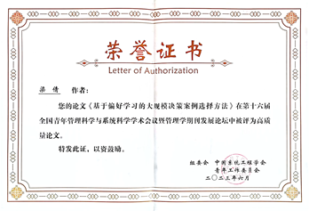 2023年6月17日-18日,第十六届全国青年管理科学与系统科学学术会议在徐州举行。禁漫青年教师梁倩博士作为第一作者撰写的论文《基于偏好学习的大规模决策案例选择方法》获得大会优秀论文奖。