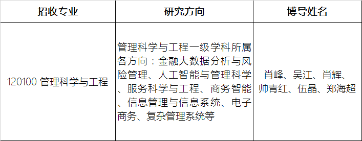 (一) 学术型硕士:(120100)管理科学与工程一级学科下设各专业研究方向包括:金融大数据分析与风险管理、服务科学与工程、商务智能、信息管理与信息系统、电子商务、复杂管理系统等。