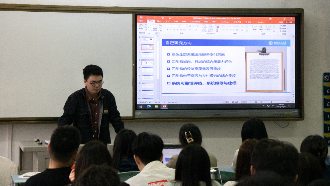 2022级博士魏志宏介绍了自己的研究方向,讨论了复杂系统的建模和分析方法,强调了科研中需要具备的数学基础、编程技术和论文书写能力的重要性,以及严谨开拓的科研精神对学术研究的重要意义。他鼓励同学们多参加学术讲座和会议,向专家请教,同时又要保持自己独立思考的能力和开放的心态,劳逸结合保持身心健康。