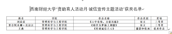 积极组织学生参加以“诚信你我,感恩回馈”为主题的摄影及宣传画设计大赛,同学们或设计学生资助宣传画,或根据相关主题拍摄照片,借助作品展示出人间冷暖、感恩你我的动人画面,传达出对家人、朋友、国家、社会的感恩,激励学生在今后的学习和生活中自立自强,以诚做人,以信处事,用自己的实际行动回报国家和社会。其中王燕同学的《传递诚信之心》被评为优秀作品。(部分作品如下)